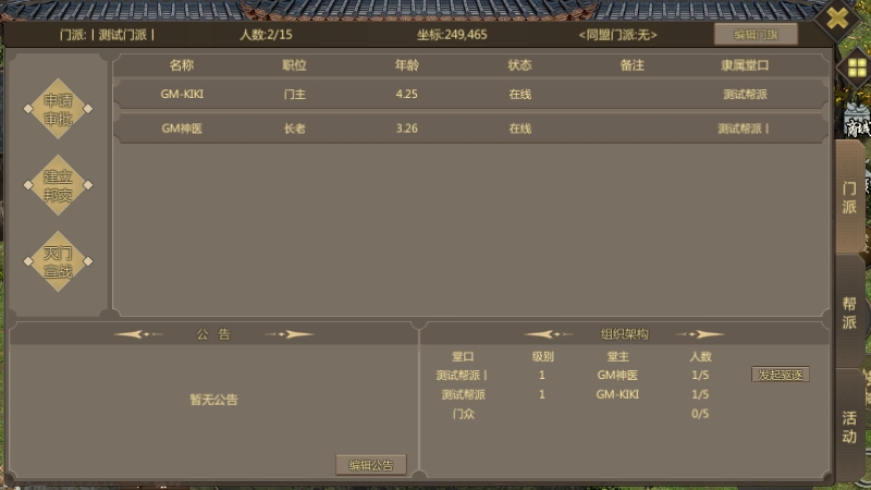 创建门派后身份变更。使用祭台的帮主变为门主,其他帮主身份变为长老。所有副帮主身份变为护法。所有帮众身份变为精英。原帮派更名为堂口。原来的五个帮派石消失。